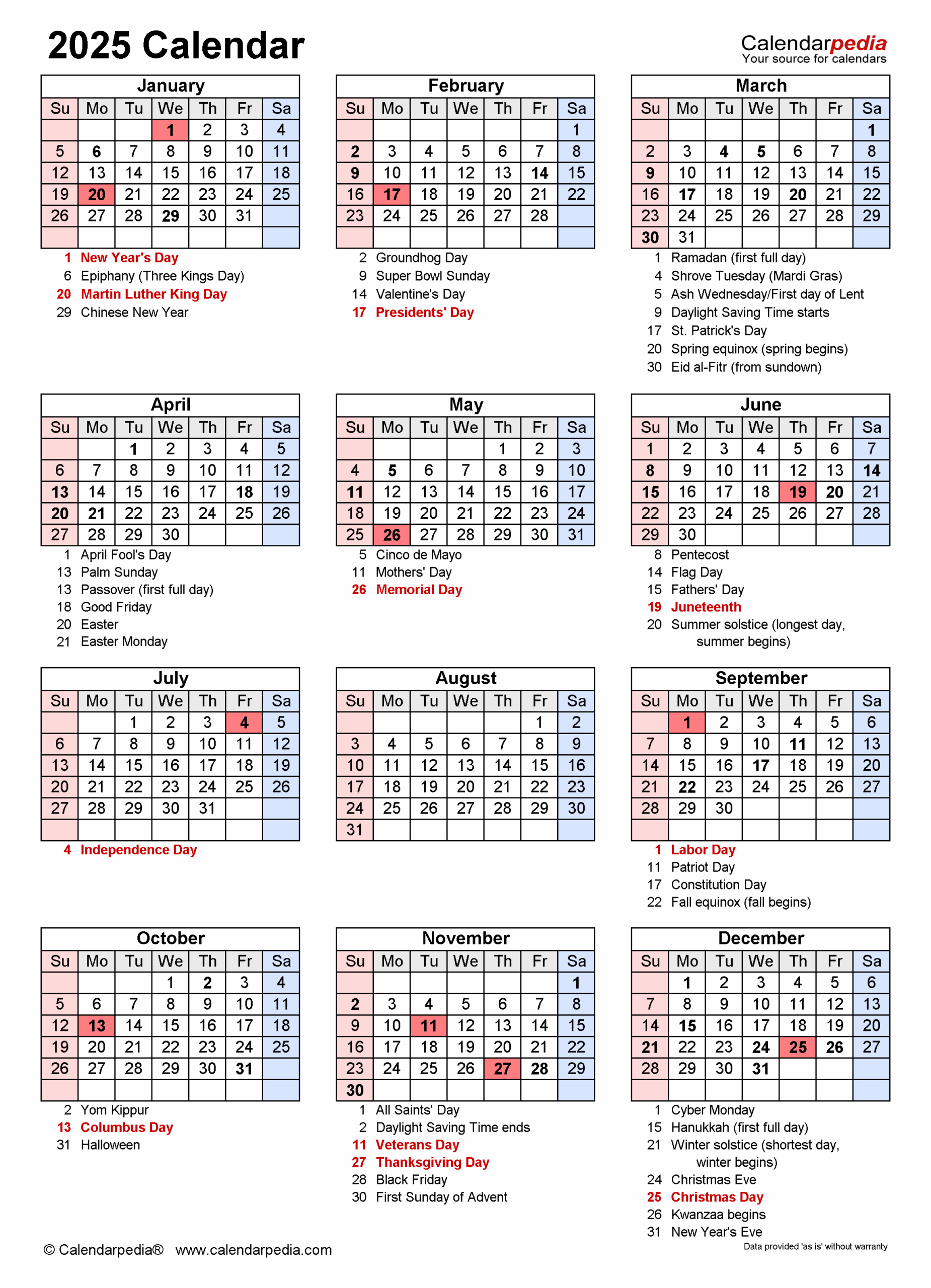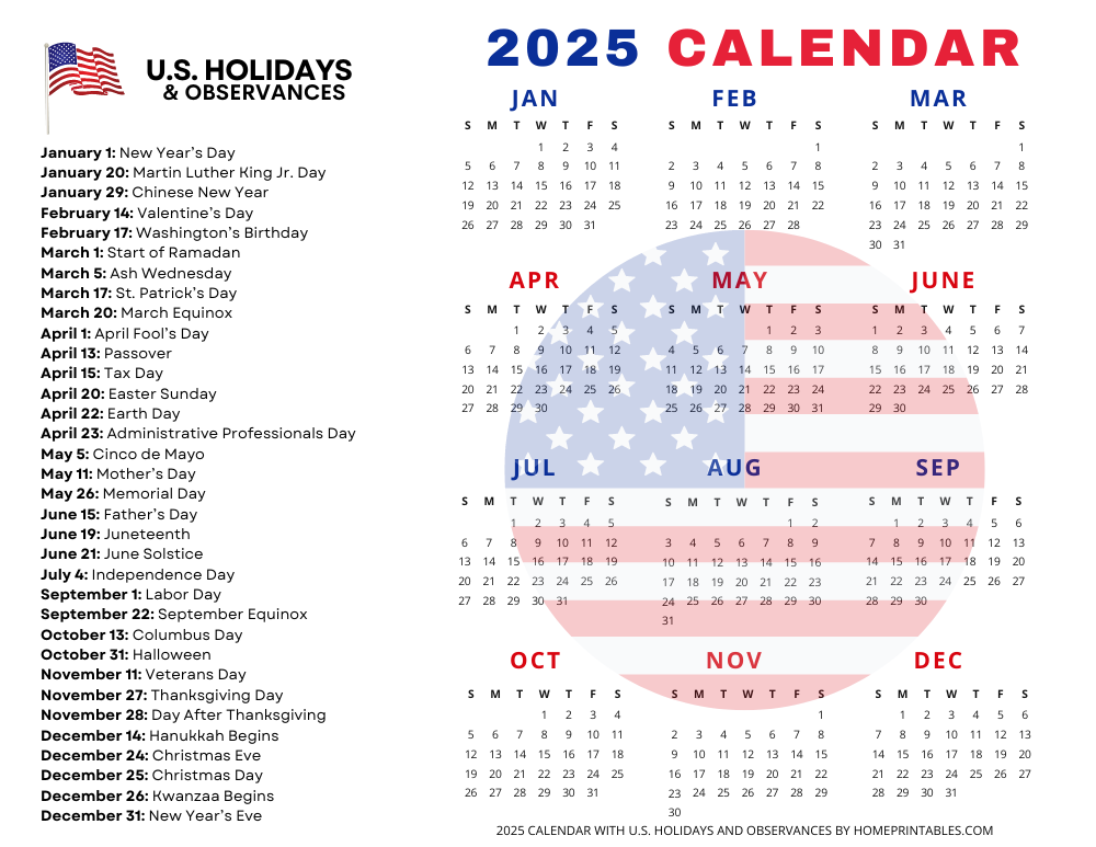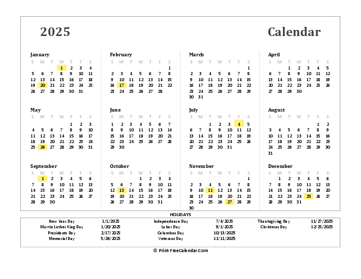 Free Printable Calendars 2025 With Holidays