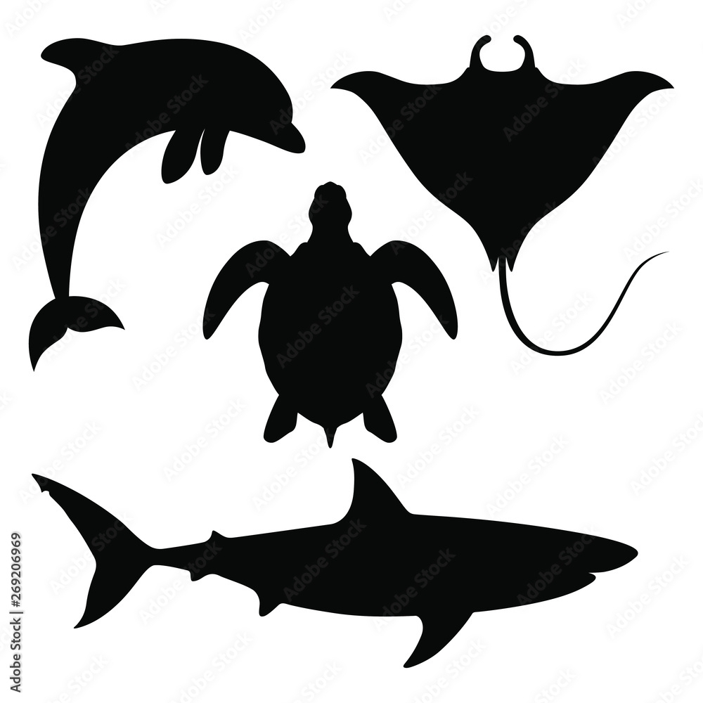Sea Animals Set Icons Black Silhouettes Dolphin Shark Turtle And