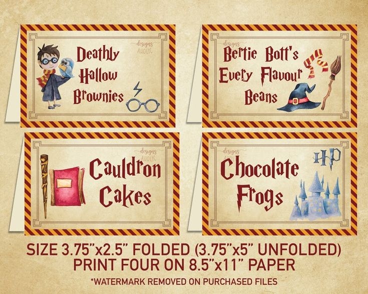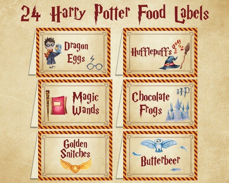 Our free printable Harry Potter food labels feature iconic symbols and fonts from the wizarding world, making them the perfect addition to your party decor. You can customize them with the names of your dishes or simply use them as-is for a magical touch.