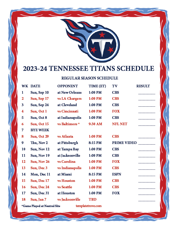 With key match-ups against division rivals and exciting prime-time games, the Titans’ schedule is sure to keep fans on the edge of their seats all season long. Don’t miss out on any of the action – download your printable schedule today!