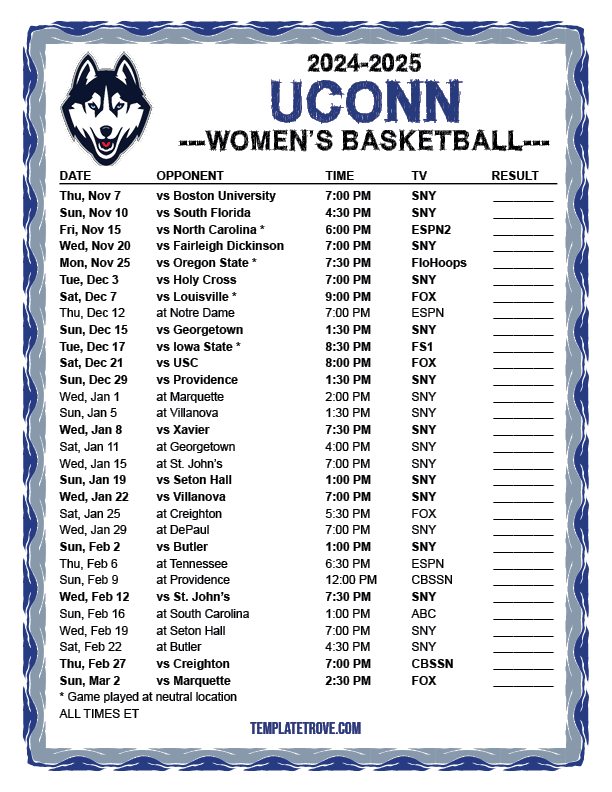Don’t rely on memory or constantly checking online for game times. Our UConn Women’s Basketball schedule printable is a convenient and practical way to stay organized and ensure you never miss a moment of the action on the court.
