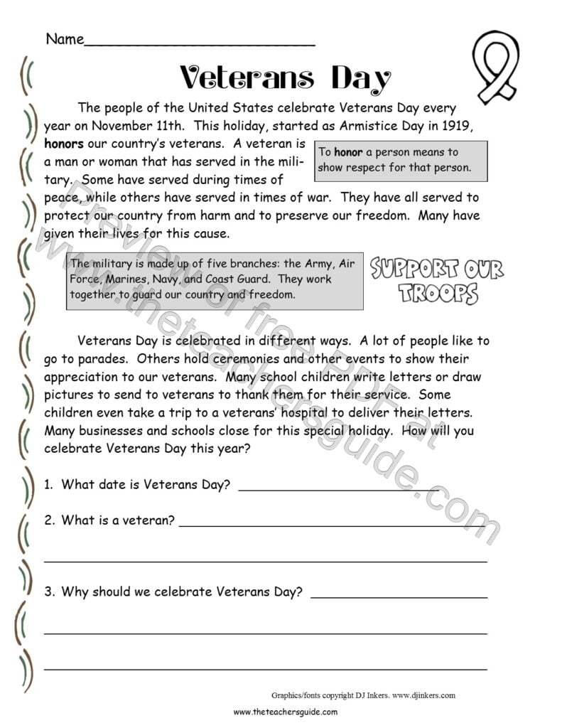 Free Printable Veterans Day Reading Comprehension Worksheets Reading