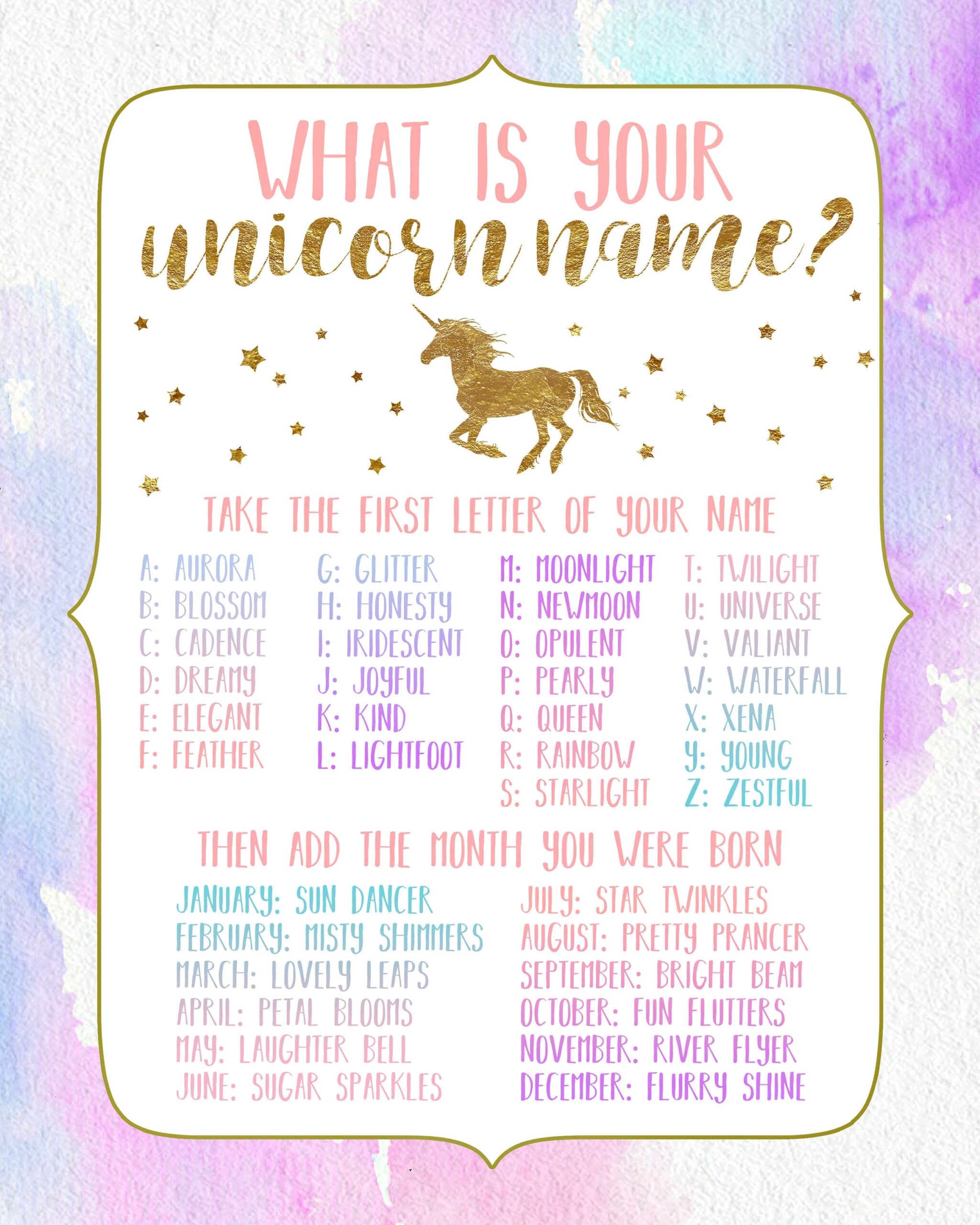 To find out your unicorn name, simply download our free printable and follow the instructions. You’ll be asked to input your birth month and favorite color, and voila! Your personalized unicorn name will be revealed.